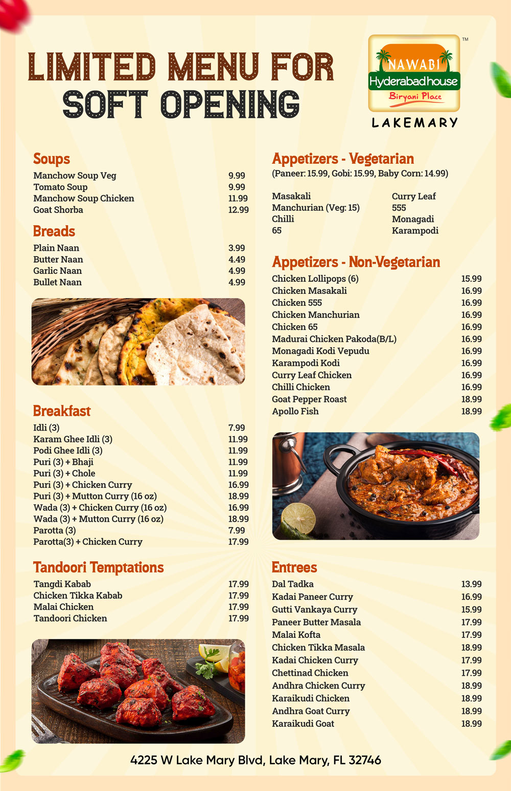Meaning of Limited Menu: A reduced selection of dishes available to order during the soft launch. The full menu will be available at the Grand Opening.